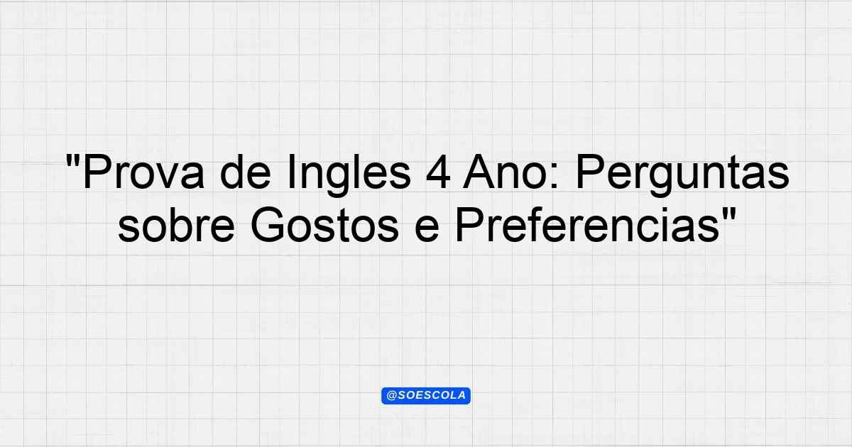 Continue lendoTema: Perguntas e respostas simples (gostos e preferências)Etapa/Série: 4º anoDisciplina: Língua InglesaQuestões: 10 Prova de Língua Inglesa – 4º Ano