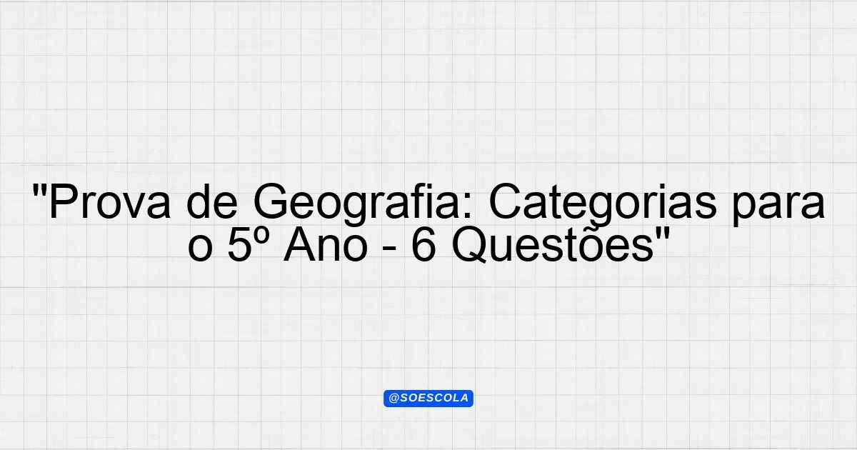 Continue lendoTema: CATEGORIAS DE GEOGRAFIAEtapa/Série: 5º anoDisciplina: GeografiaQuestões: 6 Prova de Geografia – 5º Ano Tema: CATEGORIAS DE GEOGRAFIA Instruções: Responda