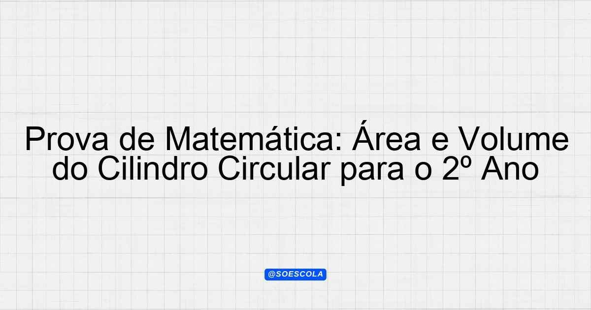 Continue lendoTema: área e volume do cilindro circularEtapa/Série: 2º ano – Ensino MédioDisciplina: MatemáticaQuestões: 15 Prova de Matemática – Área e