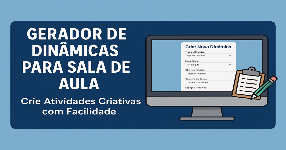 Você já precisou preparar uma atividade de integração, quebra-gelo ou cooperação e ficou sem ideias? Agora isso não será mais um problema! O Gerador de Dinâmicas para Sala de Aula é uma ferramenta online que cria atividades personalizadas para diferentes tipos de turmas em poucos cliques.